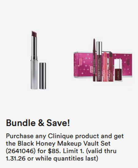 Shop in store and purchase any Clinique product and get the Black Honey Makeup Vault Set (2641046) for $85.