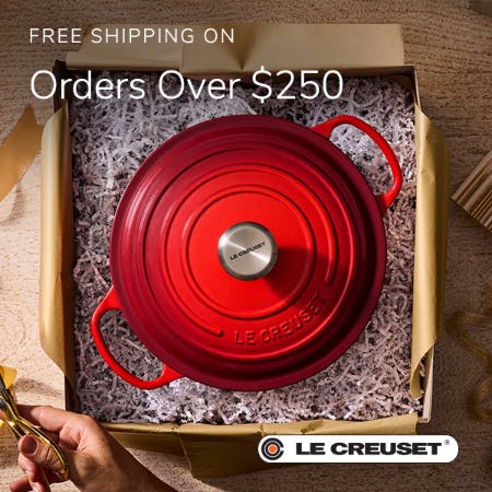 Free Shipping on all orders over $250 is available in U.S. Le Creuset Outlets only. Free shipping on orders over $250 is based on a pretax total. Tax not included.