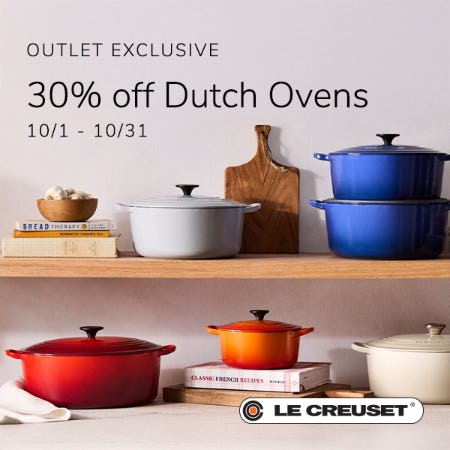 Dutch Oven savings valid October 1st – October 31st, 2025, at participating U.S. Le Creuset Outlet Stores. Not valid at Le Creuset Signature Boutiques or online.