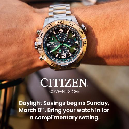 Daylight Savings begins, Sunday, March 8th. Bring your Citizen watch in for an complimentary setting.